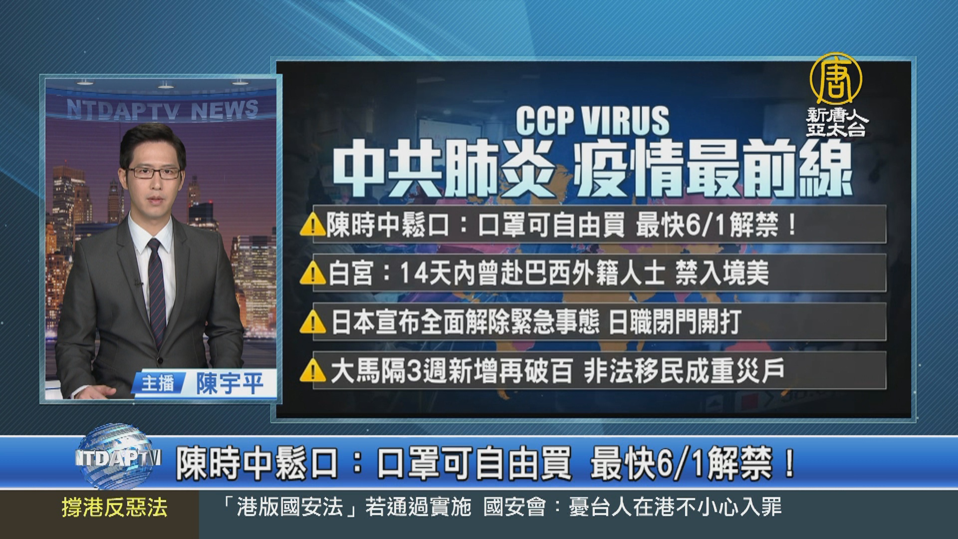 【新唐人亞太台 2020 年 05 月 25 日訊】台灣連續四天零確診,指揮官陳時中鬆口:口罩銷售最快預計6月1日解禁,國內可自由買與實名制並行!美國擴大中共病毒旅行禁令,白宮宣布,禁止非公民從巴西入境,日本宣布全面解除緊急事態,日職6月19日閉門開打。馬來西亞時隔3週後新增中共肺炎病例再度破百,其中,超過百名感染者是非法移民,成為新一波疫情重災戶。