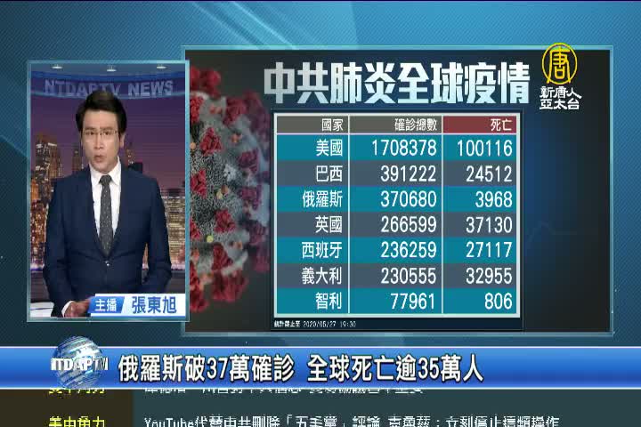 【新唐人亞太台 2020 年 05 月 27 日訊】來看到,中共病毒肺炎在部分國家的災況,目前全球累計超過561萬人確診,超過35萬人過世;雖然多國採取解封措施,不過,巴西、俄羅斯和智利,仍然都出現單日死亡數新高。來看到最新統計,美國確診170萬8千多人、死亡累計超過10萬人;巴西確診達39萬1千多例、死亡超過2萬4千5百人;俄羅斯確診超過37萬例,有3千9百多人死亡。另外,智利單日新增3千9百64例確診,創下新高,還有2名閣員染疫。全球疫情中,中共、伊朗、北韓等國家被認為嚴重低報數據。