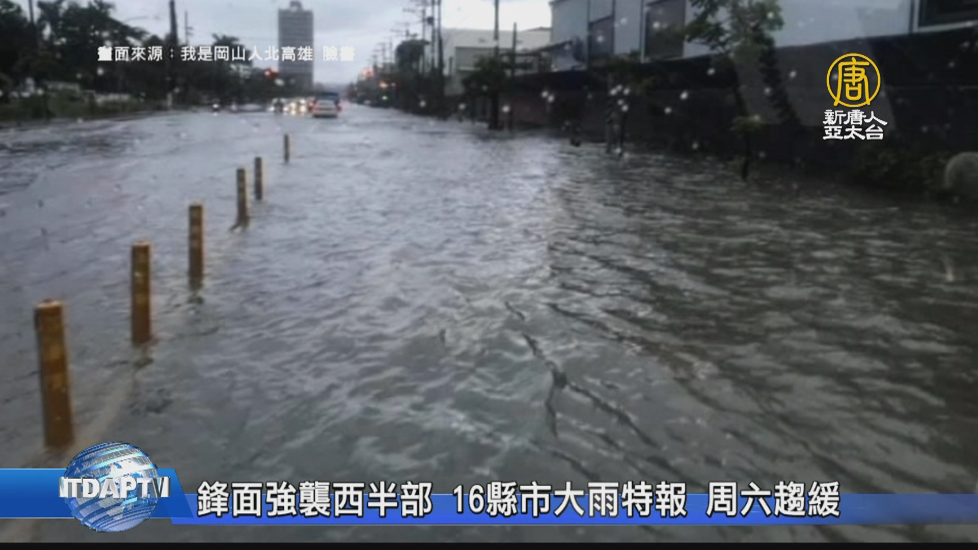 【新唐人亞太台 2020 年 05 月 28 日訊】受鋒面影響,全台有雨,今天清晨的一陣豪大雨,導致高雄岡山及燕巢一早就出現淹水狀況,其中,嘉華路涵洞一度水深及腰,嘉興路高速公路下,淹水有半個輪胎高,不過水來得急也退得快,大約8點左右就全部消退。氣象局表示,週四週五兩天,鋒面持續在台灣中南部上空徘徊,西半部容易出現短時強降雨,稍早已針對全台16縣市,發布大雨特報。預計周六鋒面遠離台灣,各地轉為多雲天氣,下週三,將恢復夏季炎熱天氣。