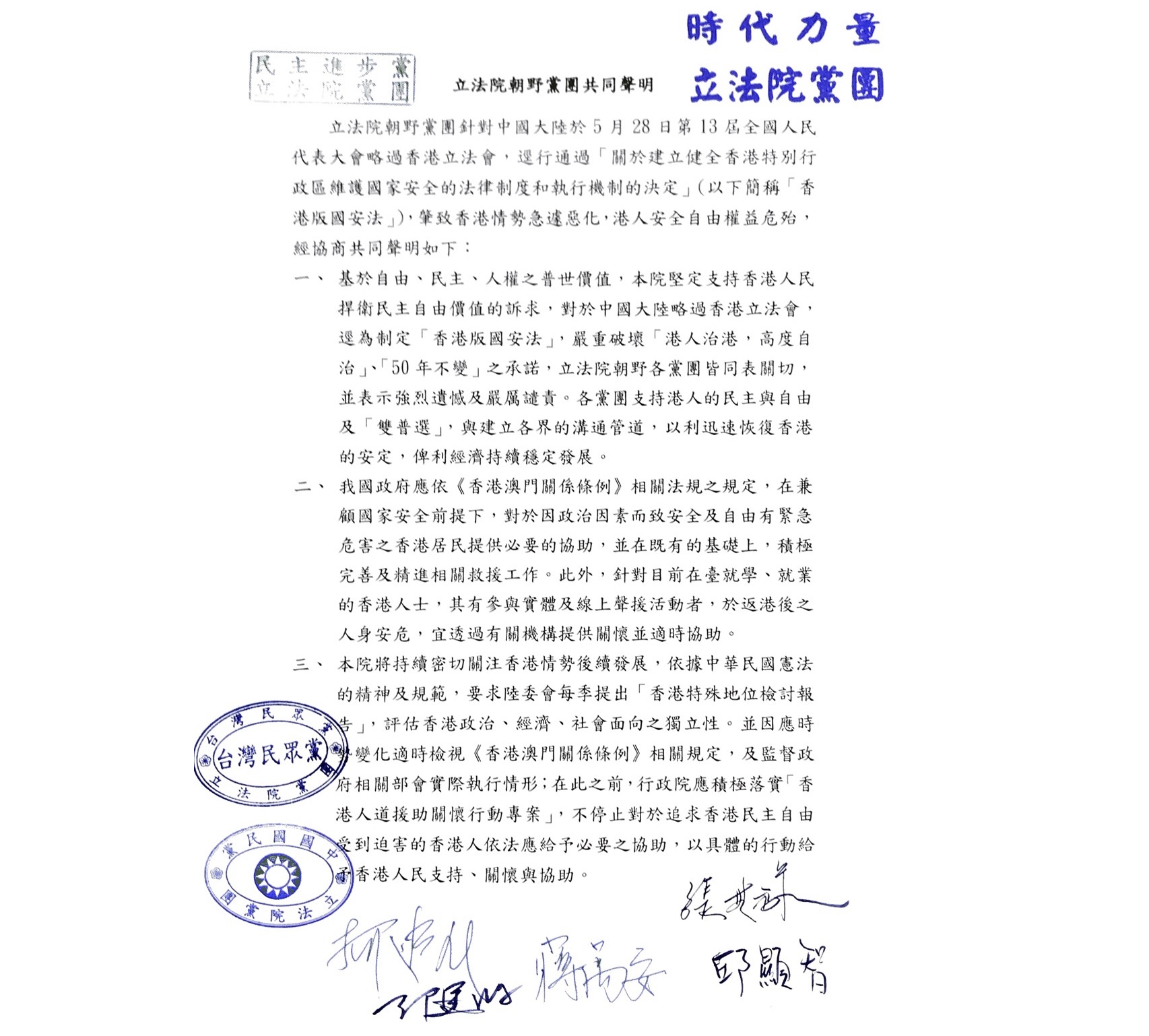 一、基於自由、民主、人權之普世價值,立法院堅定支持香港人民捍衛民主自由價值的訴求,對中國人大略過香港立法會制定破壞香港自治的港版國安法作為,嚴重破壞「港人治港,高度自治」、「50年不變」之承諾,