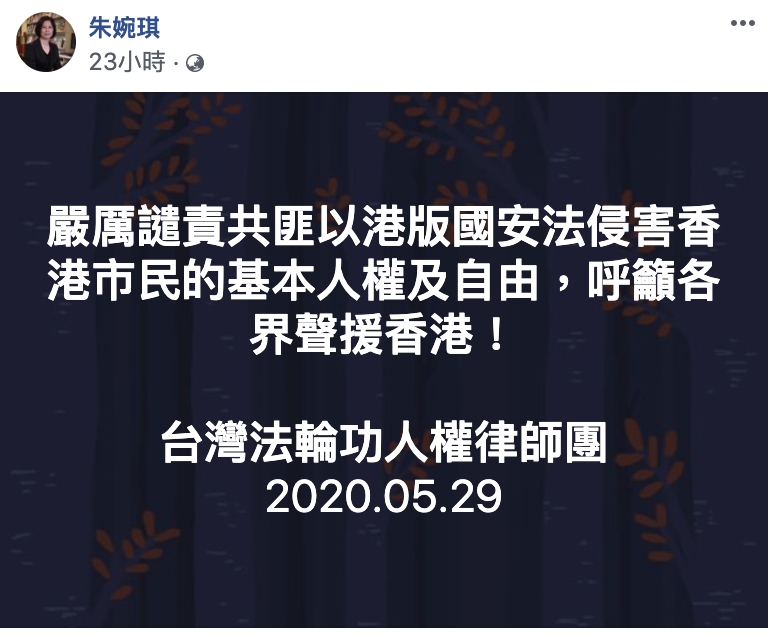 台灣法輪功人權律師團29日聲援香港,「嚴厲譴責共匪以港版國安法侵害香港」。(截圖/人權律師朱婉琪臉書)