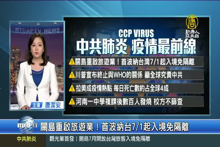 【新唐人亞太台 2020 年 05 月 30 日訊】再來帶您快速瀏覽中共肺炎疫情重點,關島重啟旅遊業!首波開放國家納入台灣,7/1起國人入境關島免隔離。川普宣布終止與WHO的關係,籲全球究責中共。拉美成疫情熱點,每日死亡數約占全球4成。中國河南一個中學,重新復課後數百人發燒,校方不做篩查,但準備封校,引發學生不滿。
