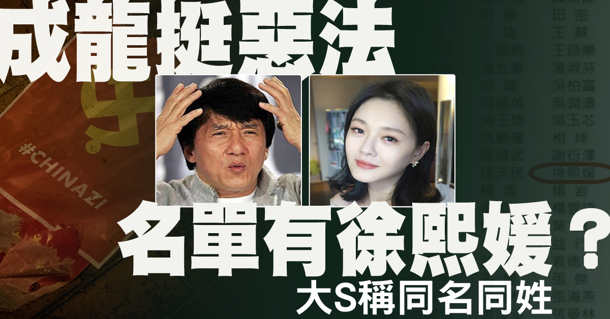中共人大28日直接繞過立法會強立港版國安法,引發國際撻伐,但身為中共政委的親中藝人成龍竟發起連署相挺,共有2605位藝文界知名人士共同參與,有眼尖的網友發現名單中竟還有來自台灣的「徐熙媛」,就是藝人大S本名,引發熱議。不過,大S對此回應「是同名同姓」。