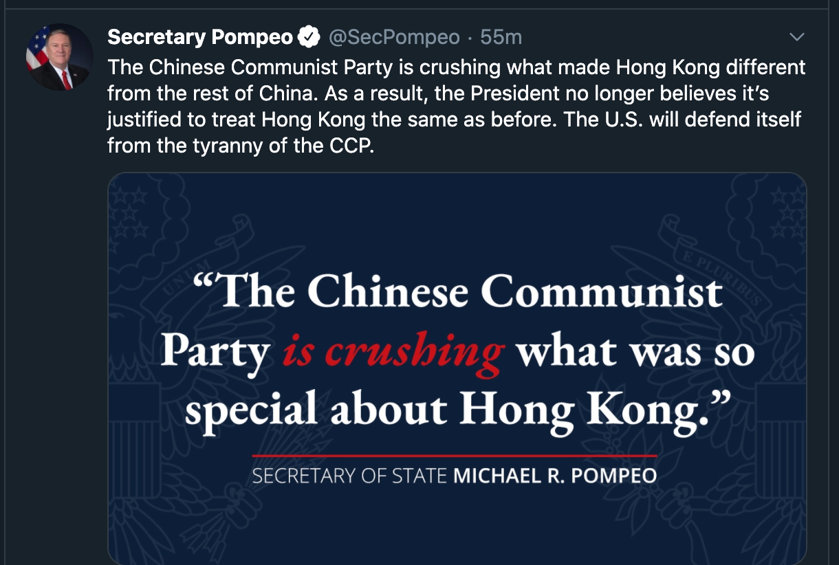 蓬佩奧:捍衛美不受中共暴政侵害 中共粉碎香港事物(截圖/蓬佩奧推特)