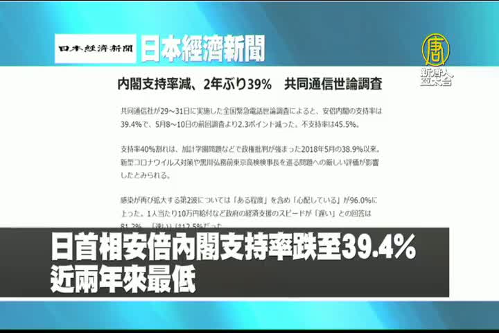 【新唐人亞太台 2020 年 06 月 01 日訊】來看到日本經濟新聞報導:日首相安倍內閣支持率跌至39.4%,近兩年來最低。