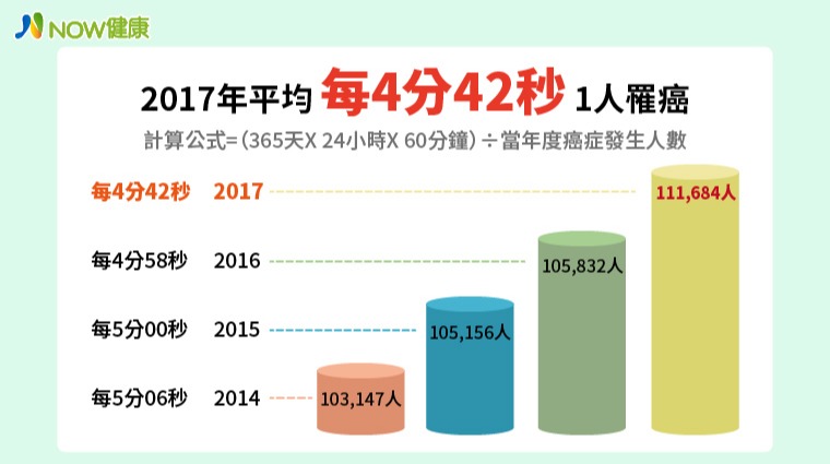 衛福部疾管署統計,2017年每4分42秒台灣增加1名癌症病患,1年增加11萬1,684名患者。(資料來源/衛生福利部國民健康署;圖/NOW健康製作)