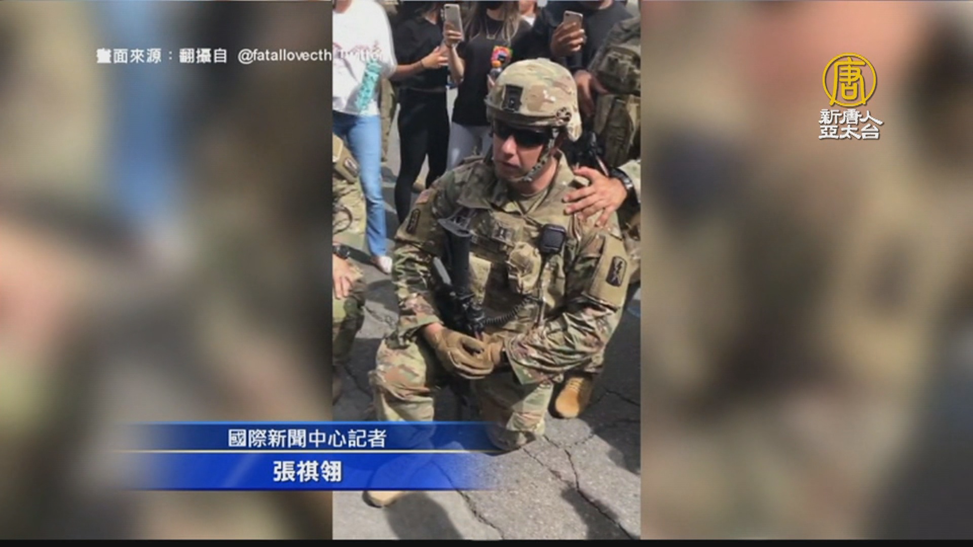 而前線的國民兵,面對示威群眾也採取不同措施,有媒體拍到,被派往洛杉磯好萊塢的國民兵,被示威群眾要求一起遊行,但國民兵回答必須堅守崗位,後來示威群眾要國民兵進行單膝跪地,多位國民兵即刻答應,很快就化解了對立與衝突。