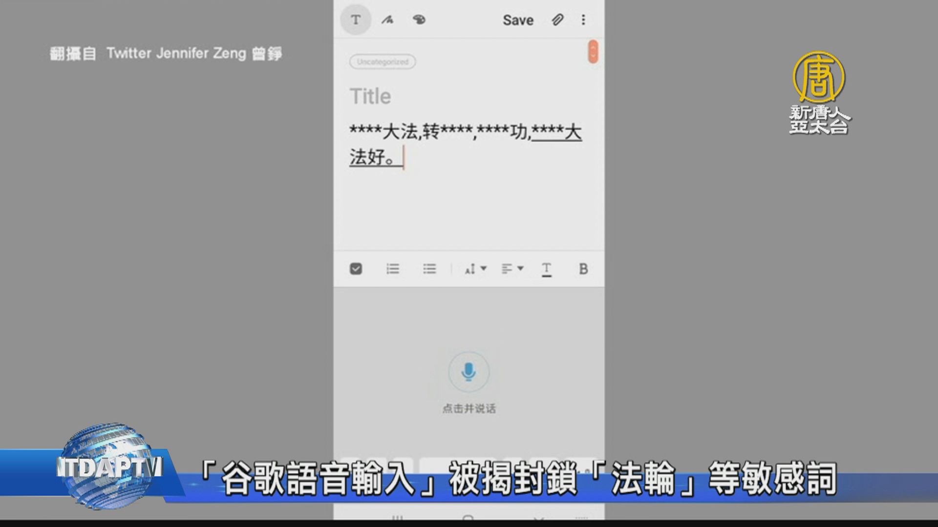 【新唐人亞太台 2020 年 06 月 03 日訊】近日,有美國網友發現使用手機上的谷歌簡體語音輸入「法輪」一詞時,竟然會自動轉變為一串星號「****」。美國媒體人曾錚日前在推特上發帖,親自測試用谷歌語音搜索時,先後使用了「法輪大法」、「轉法輪」、「法輪功」、「法輪大法好」等關鍵詞嘗試進行搜索,結果都一樣被封鎖。包括The Verge在內的數家英文媒體,近日也相繼做出報導,YouTube的影片或直播中含有的「共匪」或「五毛」等字樣,或批評中共的評論,會在15秒鐘左右自動刪除。YouTube管理方公開解釋說,出現上述異常情況可能是因為平台發生「系統錯誤」 ,已經對相關情況展開調查。外界懷疑這些海外社交平台是否已經「染紅」,正在配合中共對海外華人用戶的言論進行政治審查。