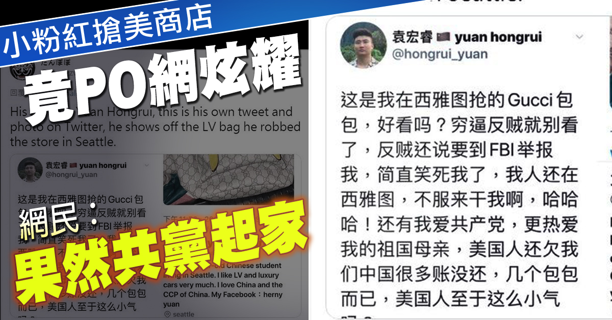 美國非裔男子弗洛依德之死引發暴亂,中共趁機煽動挑撥,現在更有陸生小粉紅在搶劫美國商店後,還高調秀出戰利品,打卡炫耀,已經在美國引起公憤,推特上被群起圍剿。還有人譏笑這名中國搶匪「GUCCI講成LV?」。還有網友說「以搶劫為榮,(中國共產黨)CCP就是這樣起家的。」
