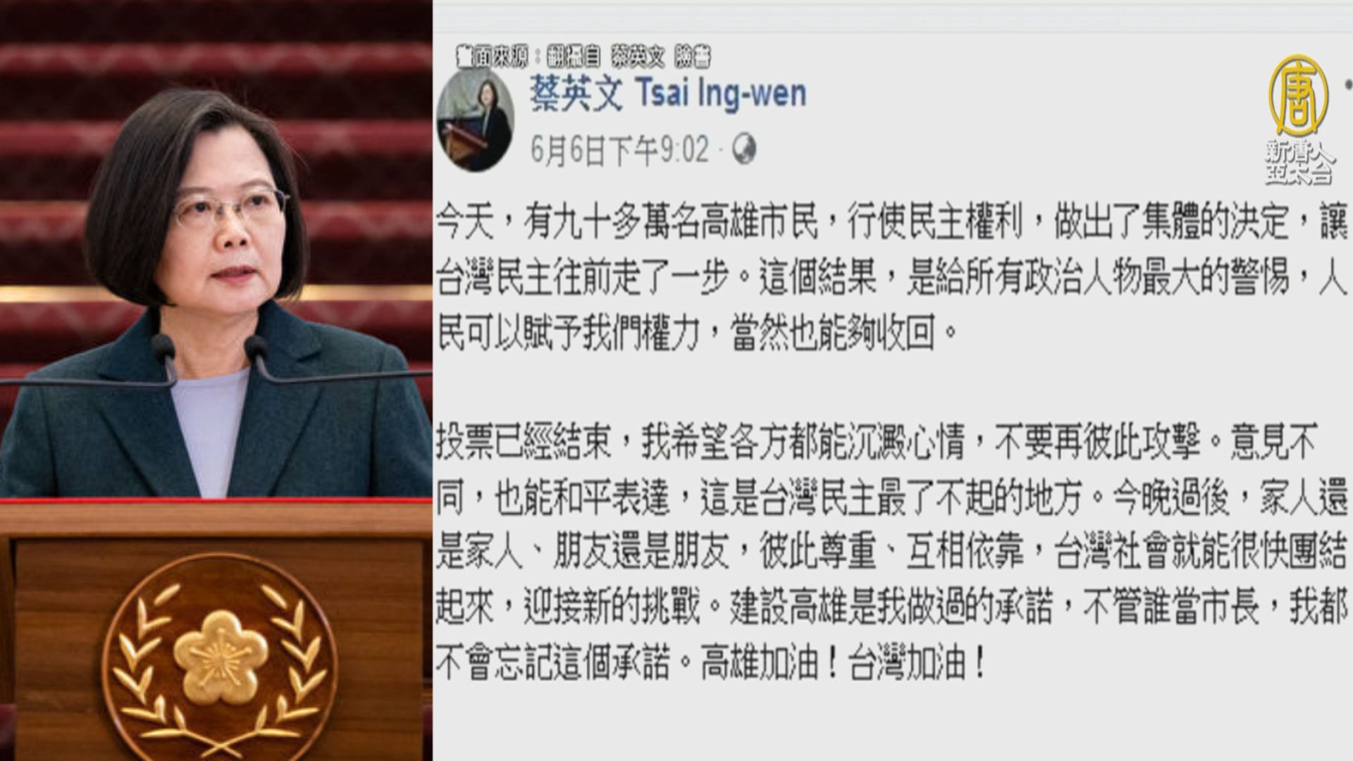 【新唐人亞太台 2020 年 06 月 08 日訊】再來看到,台灣民主史上首次,高雄市長韓國瑜被以93萬9090票,遭到罷免;總統蔡英文周六晚上表示,這是對所有政治人物的警惕,權力可以被人民收回