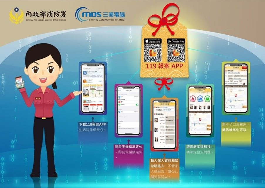 嘉義縣消防局表示,因應智慧型手機及APP運用的普及化,消防署已建置「119報案APP」提供全國民眾免費下載使用,「119報案APP」會引導民眾即時開啟手機定位功能,在119報案時,能快速將所在位置等資料提供給119受理人員,縮短詢問及等待救援時間,爭取黃金救援時間。