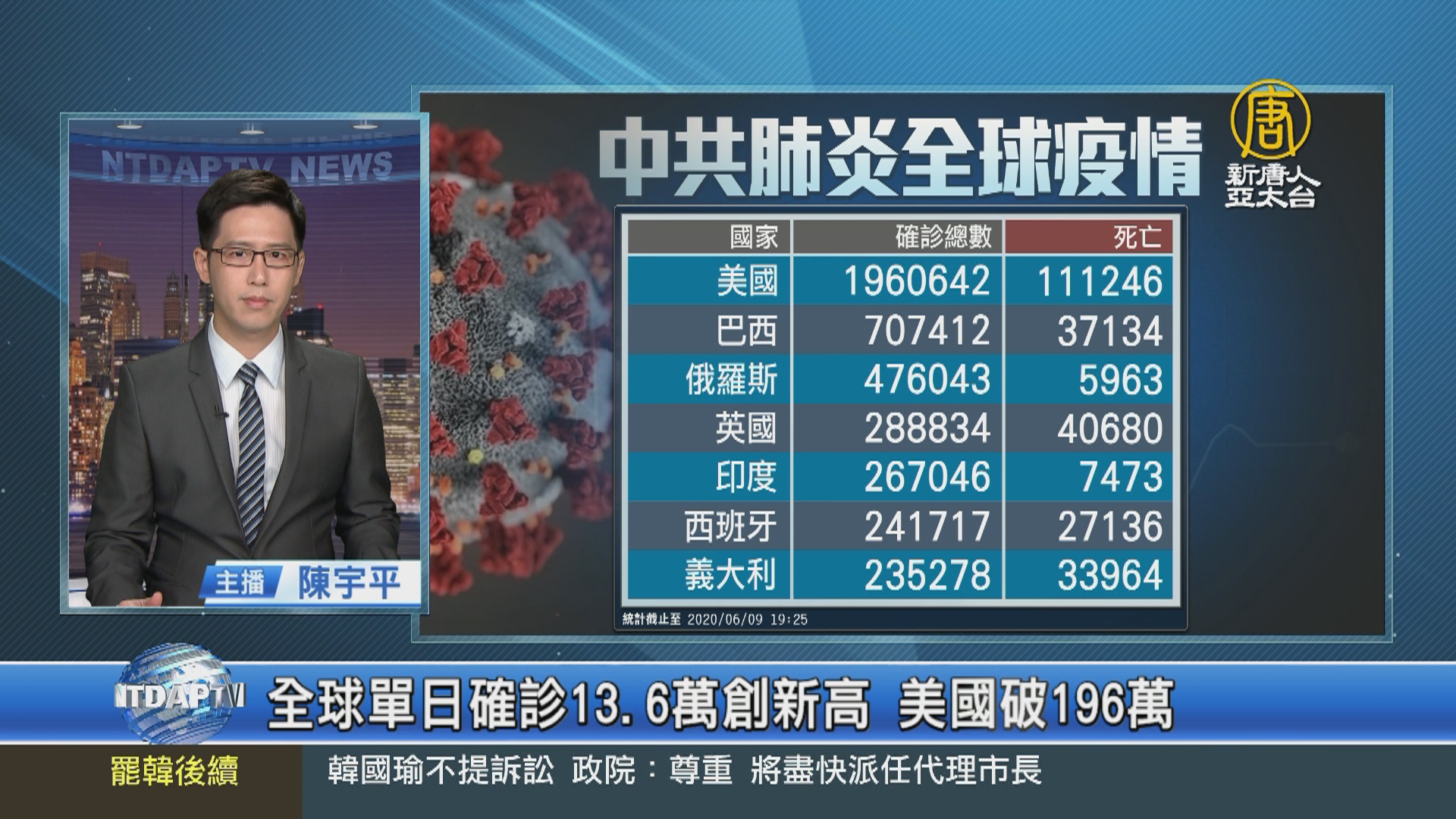 【新唐人亞太台 2020 年 06 月 09 日訊】帶您看到,中共肺炎最新動態,目前全球累計超過 711萬人確診、40萬6千多人死亡。世界衛生組織(WHO)今天表示,6月7日全球通報,超過 13萬6千起新增病例,創下至今最高單日增幅,而其中近 7成5病例出自 10個國家,大多來自美洲和南亞。其中美國的確診數飆破196萬例,死亡人數超過11萬人。巴西確診也突破70萬例,死亡人數超過3萬7千人。不僅全球疫情惡化,中美洲也還沒有達到高峰。菲律賓政府今天也宣布,在疫苗問世之前,數千萬學童都不能回學校上課。另外,在全球疫情中,中共、伊朗、北韓等國家,被認為嚴重低報數據。