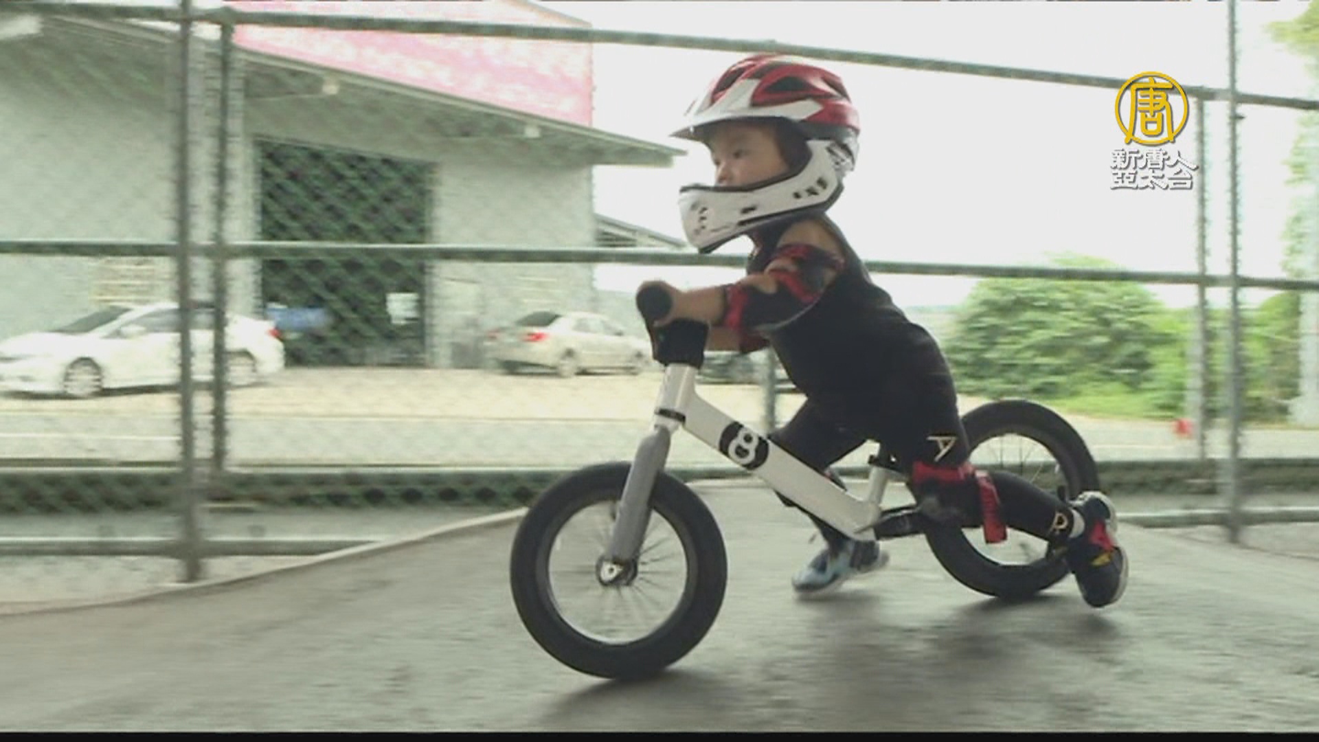 頭戴安全帽,小朋友來到這裡迫不及待的下場遊玩,騎的是日本流行的滑步車。