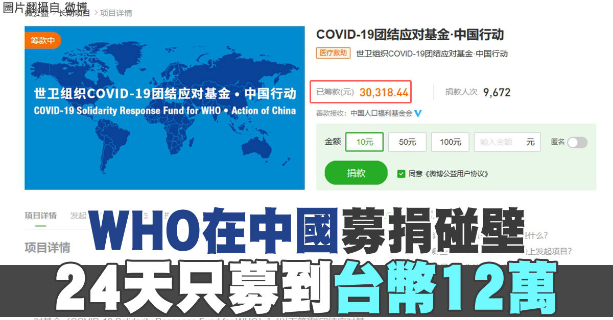 WHO在中國募捐碰壁 24天只募到台幣12萬