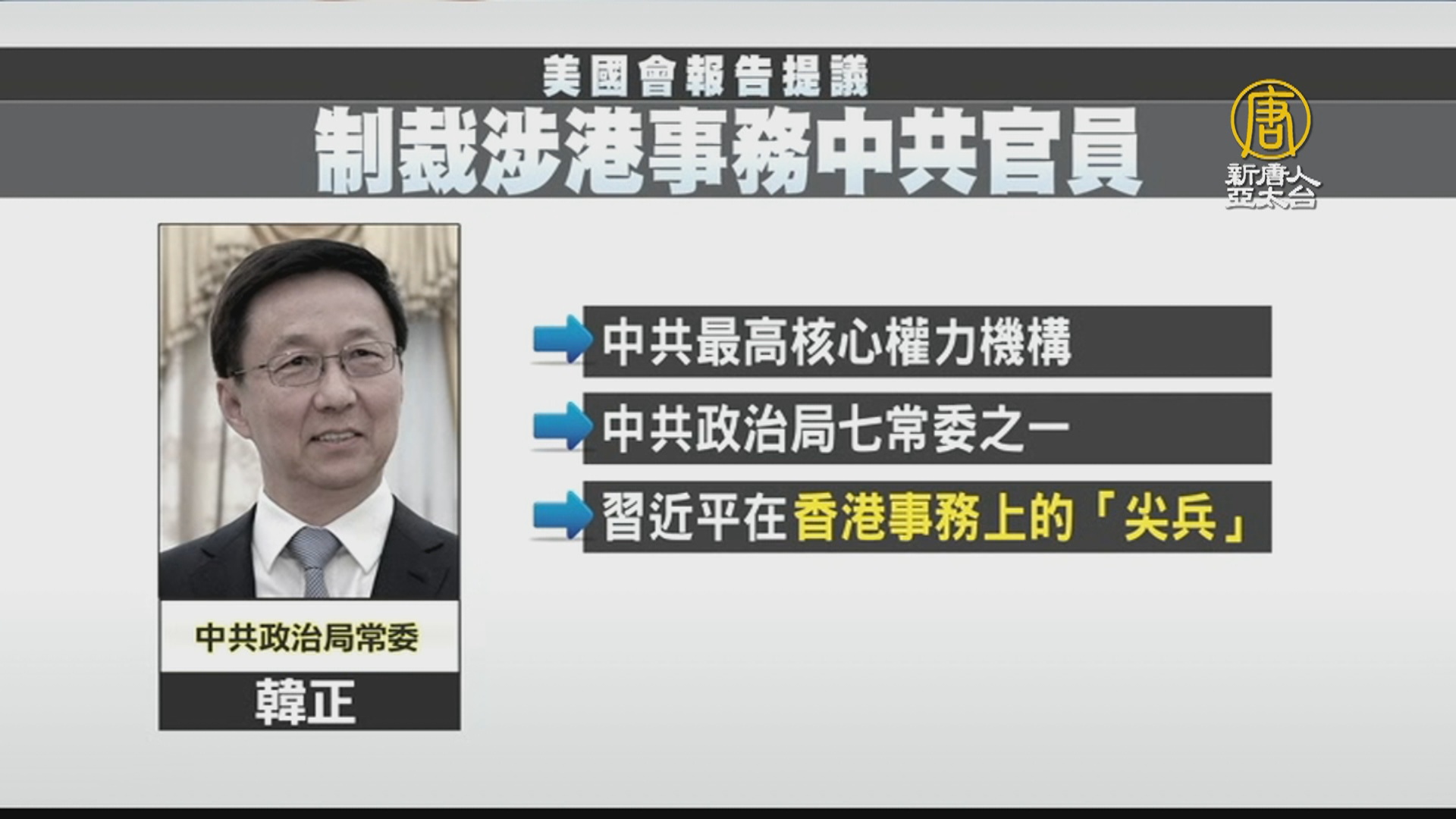 報告提議,對涉港事務的中共官員進行制裁,包括中共國務院港澳事務辦公室主任夏寶龍、中共駐香港聯絡辦公室主任駱惠寧,以及中共政治局常委韓正。報告提到,韓正是中共最高核心權力機構——中共政治局七常委之一,同時也是中國國家主席習近平在香港事務上的「尖兵」。