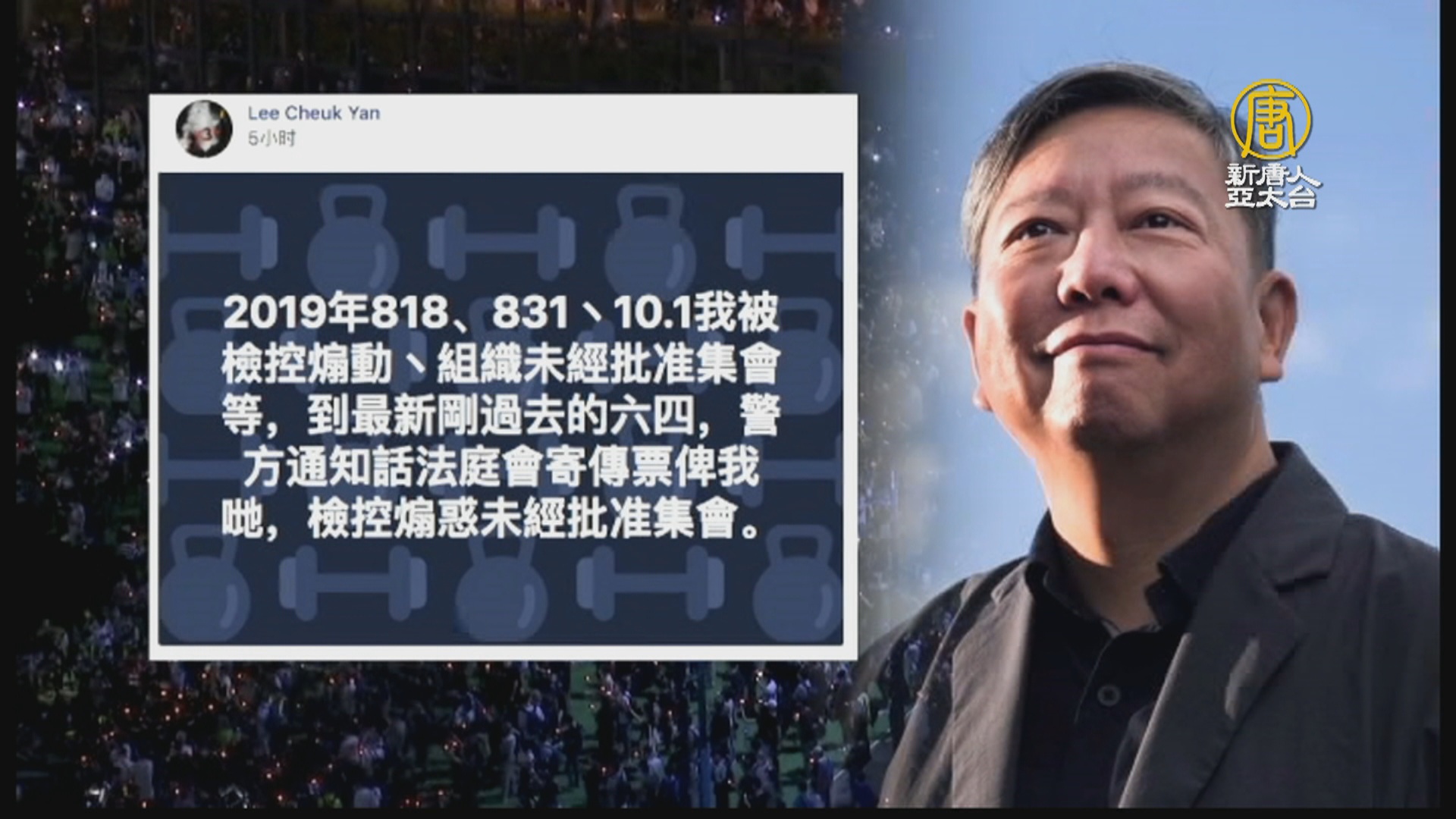 【新唐人亞太台 2020 年 06 月 12 日訊】早安新唐人,先帶您關心,上個星期,香港支聯會主辦6.4紀念活動,上萬港人自律且和平集會,然而,昨天(12日),香港支聯會主席李卓人、副主席何俊仁等四人,收到了警方的檢控通知。對此,支聯會發聲明表示。香港市民在《 基本法》保障下有集會和遊行權利,警方打壓集會完全是政治目的,企圖熄滅已有30年的維園燭光,更收緊港人自由空間。支聯會對於警方 秋後算帳,無畏無懼,並將堅持延續維園燭光,抗議中共暴政。