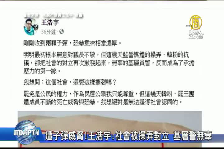 【新唐人亞太台 2020 年 06 月 12 日訊】桃園市議員王浩宇11日在臉書貼文提到,自己受到死亡威脅,今天中午,他在臉書更新現況提到,「剛剛,收到兩顆子彈,恐嚇意味相當濃厚。明明根本無意對議長不敬,但這幾天藍營媒體的操弄、韓粉的抗議,卻把社會的對立再次激發起來,無辜的基層員警,成為了承擔壓力的第一線。」