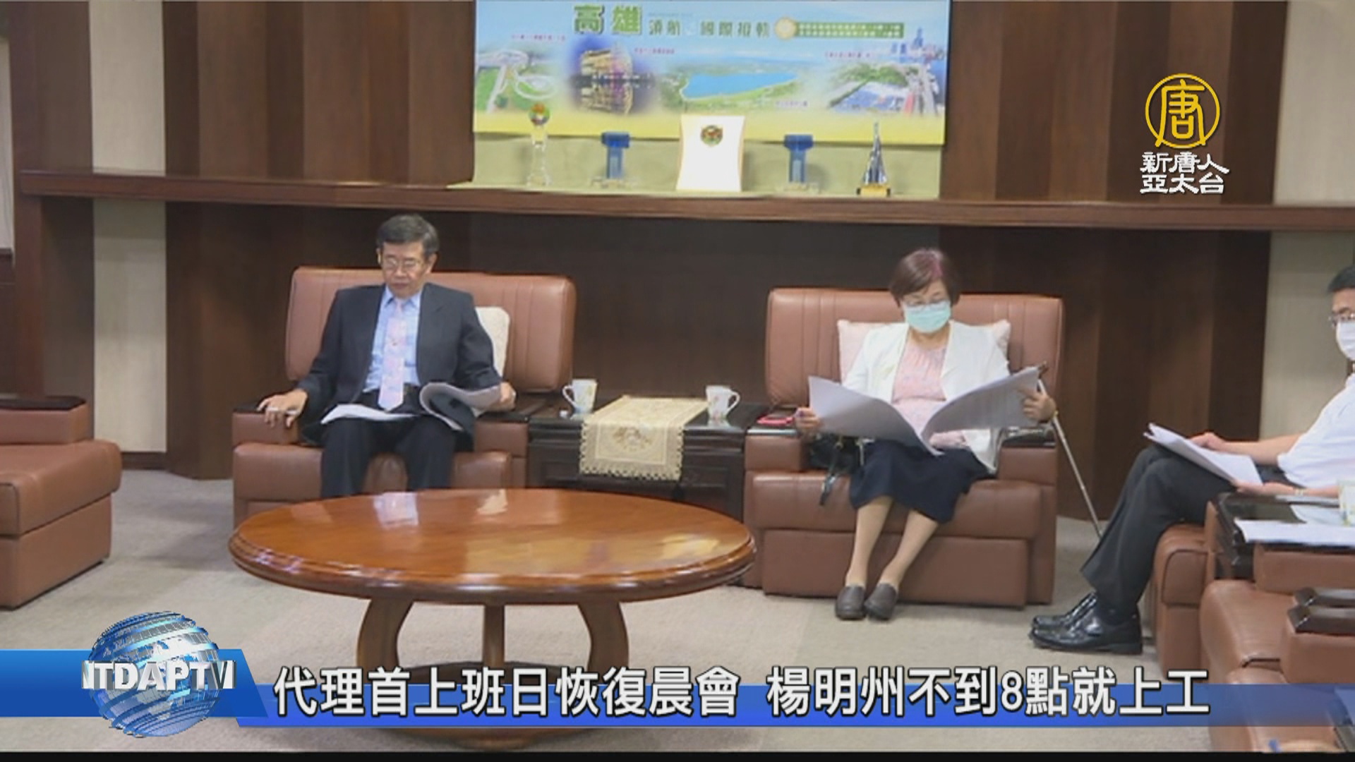 【新唐人亞太台 2020 年 06 月 15 日訊】鏡頭轉回台灣,高雄市代理市長楊明州,上任後第一個上班日,除了將辦公地點從鳳山改回到四維行政中心外,也恢復陳菊時代的「晨會制度」。下午他也首度主持防疫會議。希望把「漢他病毒」等不利觀光的因素排除掉,讓民眾願意到高雄來,振興經濟。