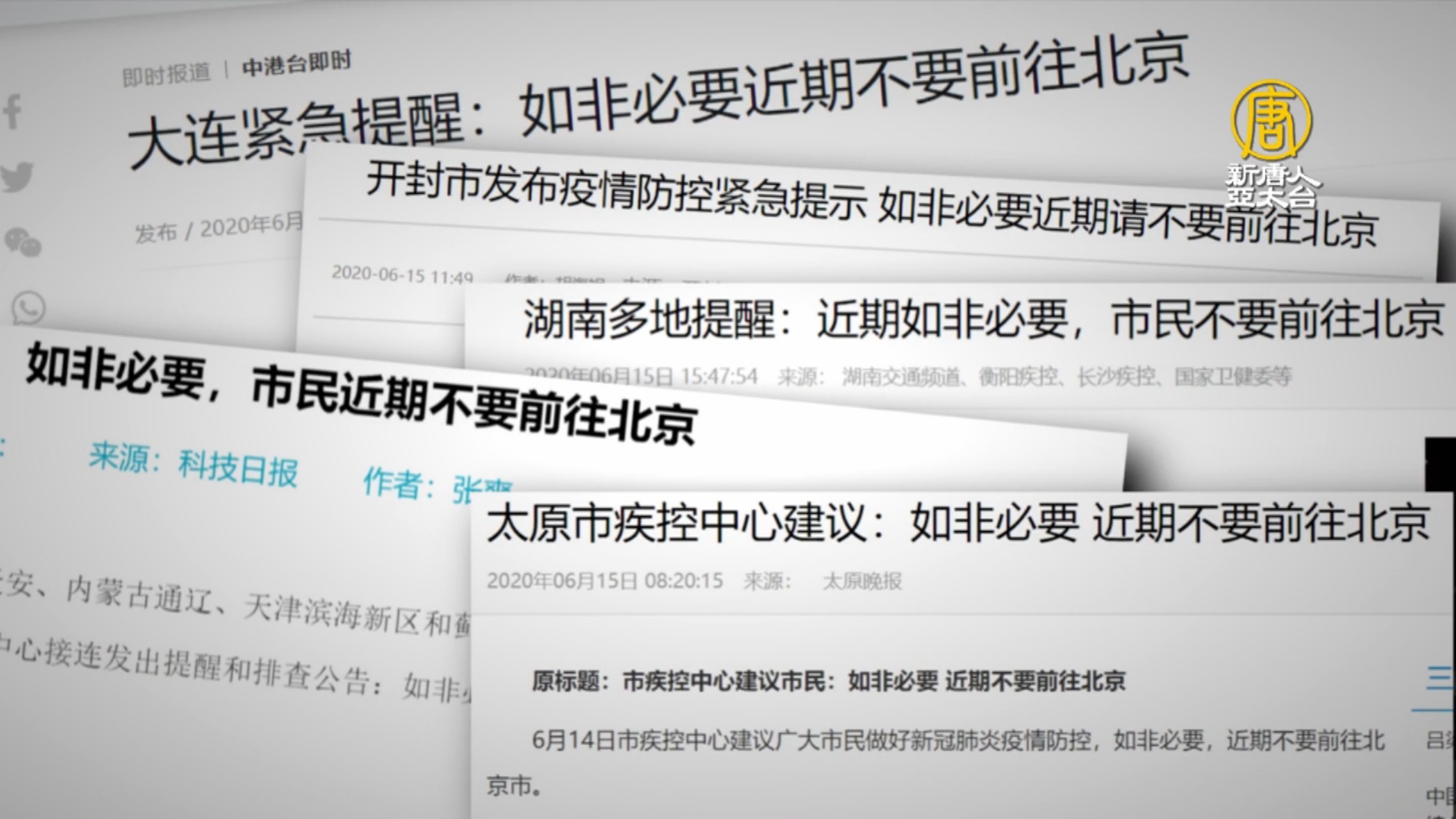 【新唐人亞太台 2020 年 06 月 16 日訊】北京第二波疫情襲來,確診病例激增,北京當局嚴密防範,避免成為第二個「武漢」,全市已經宣告進入「非常時期」,全城戒備,人心惶惶。而疫情已經對外擴散,各省市紛紛發出通知,盤查6月後去過北京的人。