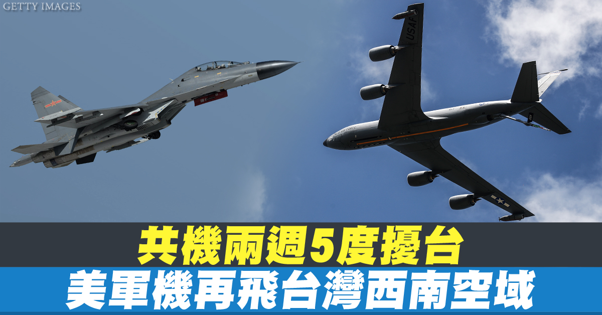 這是中共軍機兩週內第5度侵擾台灣空域。另外,美軍上午一架KC-135加油機在我國東南方外圍空域出沒,還有一架RC-135偵察機也穿越巴士海峽,在台灣西南方外圍空域出沒。