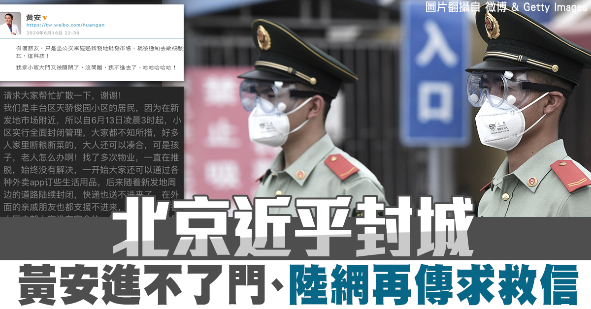 中共肺炎(武漢肺炎)疫情肆虐全球,近日北京疫情越演越烈,16日深夜緊急將疫情防控上調到二級響應。立場親共的台籍藝人黃安,近日飛回北京,哪知飛機一落地,肺炎疫情就又再度爆發了,他也受到波及,被關在社區門外進不去。一位北京豐台區居民在網上發出了第一封求救信,引起網友們的關注。