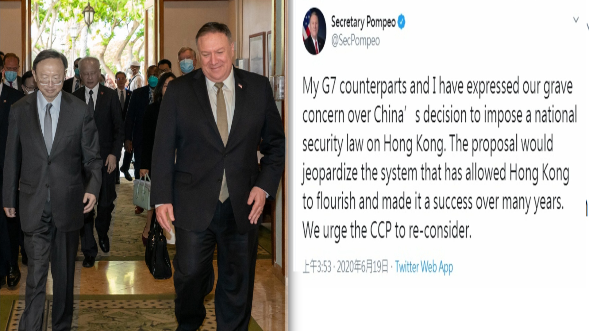 【新唐人亞太台 2020 年 06 月 19 日訊】早安新唐人,先來關心,美中高層夏威夷會談落幕,美國國務卿蓬佩奧,在今天台北時間凌晨,刊登與中共中央政治局委員楊潔篪的合照,蓬佩奧寫道,「楊潔篪再次承諾履行兩國之間第一階段貿易協定的所有義務。」而三小時後,蓬佩奧再發推文表示,「我和七國集團的盟友,都對中共決定在香港實施國安法表示嚴重關切。這項提議 將危及 香港蓬勃發展的多年體制。我們敦促中國共產黨重新考慮。」
