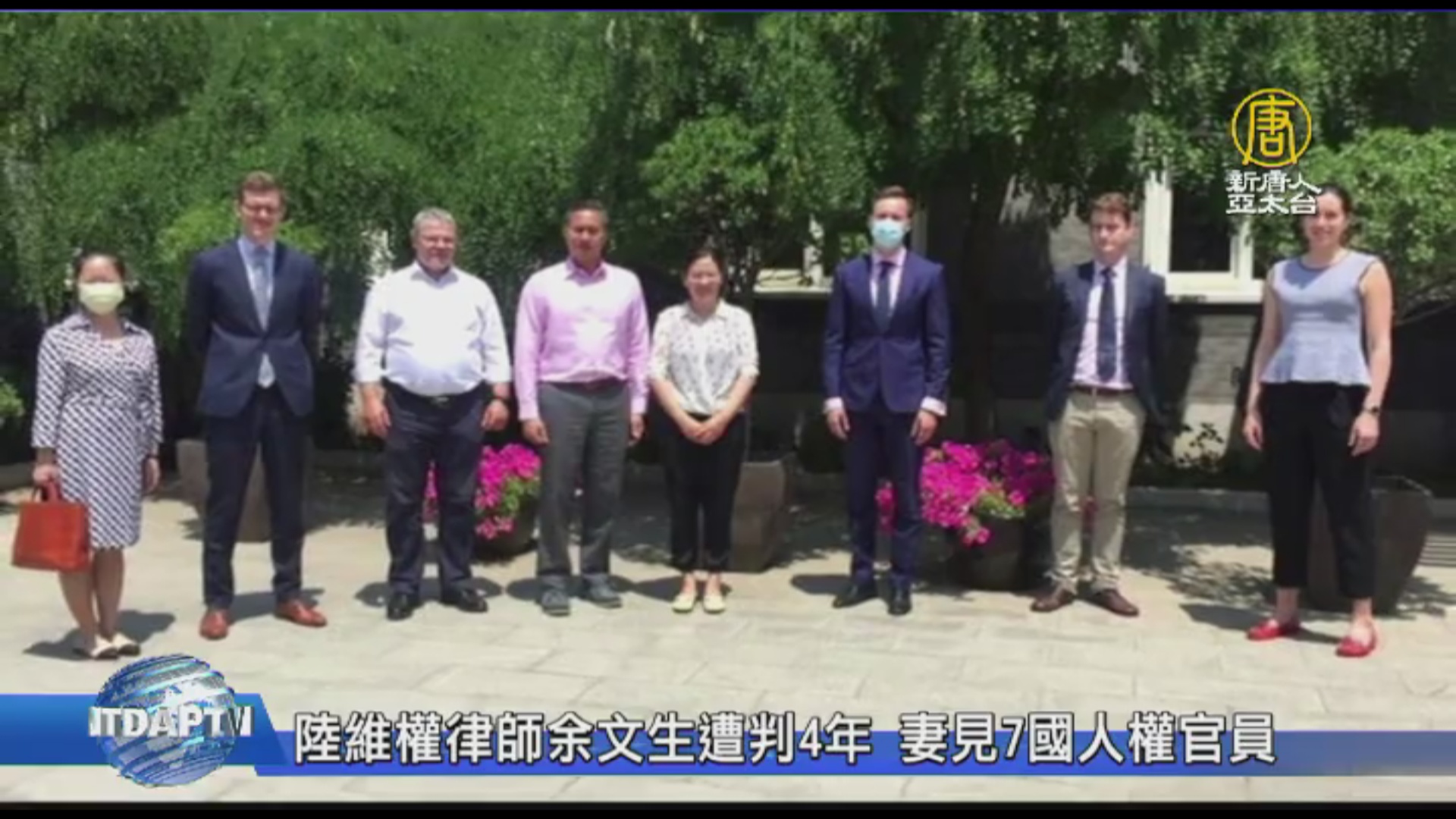 【新唐人亞太台 2020 年 06 月 19 日訊】中國消息,一件判決再度提醒國際憂心港版國安法。已被關押2年多的中國維權律師余文生,6月17日被中共當局法院以所謂「顛覆國家政權」罪,判處有期徒刑4年,余文生的妻子會見7國人權官員,呼籲制止中共的違法行為。