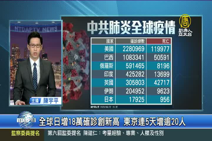 【新唐人亞太台 2020 年 06 月 22 日訊】帶您看到,中共肺炎最新動態,目前全球公開數據,累計超過893萬人確診、46萬人死亡,不過,中共、伊朗等國家,被認為嚴重低報數據。根據世界衛生組織公布的報告,全球24小時內新增18萬3千多例確診,創下新高,其中超過11萬6千例來自北美洲及南美洲。美國確診超過228萬例,死亡將近12萬人。巴西確診超過108萬3千多人,5萬5百多人死亡。確診數高居全球第四的印度,隨著數百萬失業移工掀起返鄉潮後,疫情恐將往廣大腹地的鄉村區前進。伊朗連續3天新增死亡病例破百,但當局仍強調,伊朗疫情還沒有到達頂峰。日本東京連續5天單日新增確診超過20人,東京累計達5千8百多例。