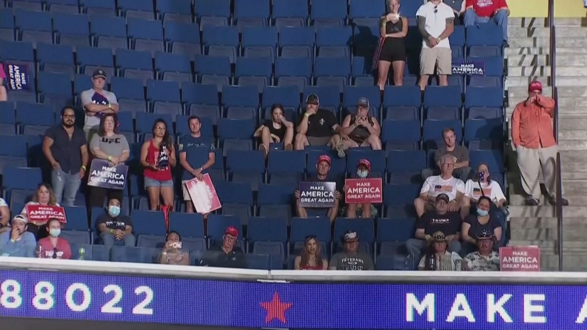 美國總統川普在奧克拉荷馬州舉行造勢晚會,不料放眼望去,場內卻出現不少空位。