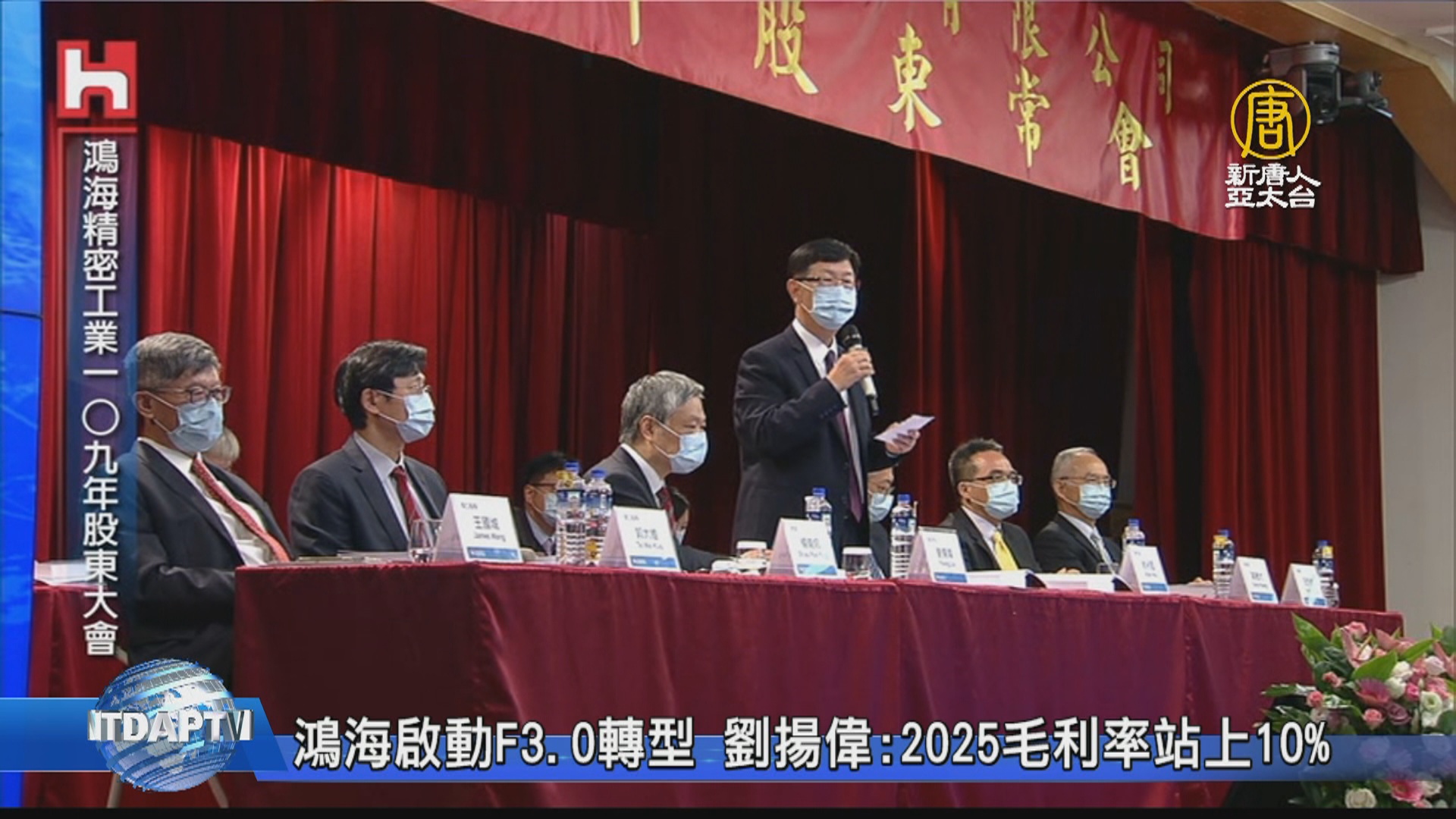 【新唐人亞太台 2020 年 06 月 23 日訊】鴻海去年由創辦人郭台銘交棒之後,營運表現受到外界矚目,董事長劉揚偉,今年首次主持股東大會,也交出滿週年成績單,面對國際大環境變化,鴻海啟動3.0轉型升級計畫,劉揚偉說目標2025年將毛利率提升到10%,預估兩三年內就會看到轉型成果。