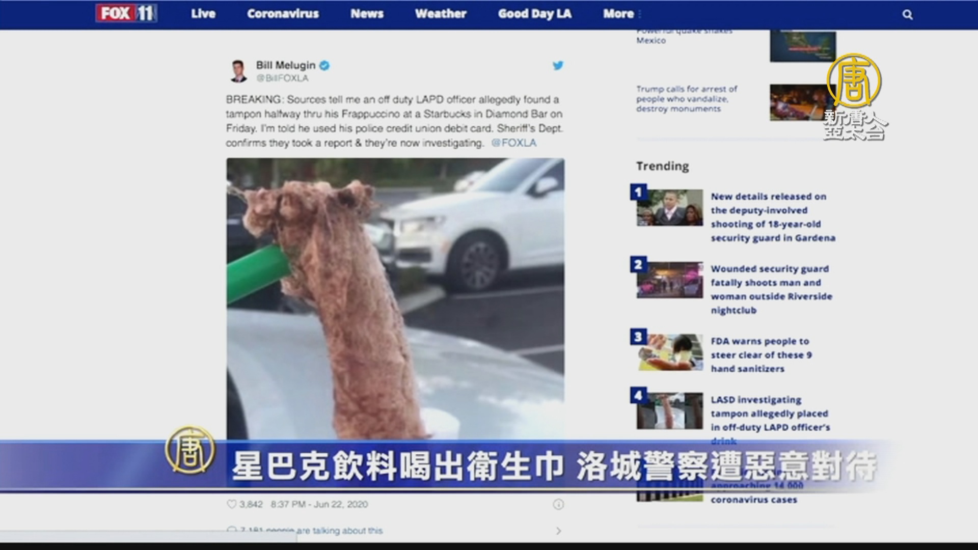 【新唐人亞太台 2020 年 06 月 24 日訊】好,激進左派在美國引發暴動與仇警行動後,上週五(6/19),一名洛杉磯警官在一家星巴克購買飲品時,居然在杯裡發現了一塊衛生巾棉條,當局表示,正在調查事件,而無辜警察遭騷擾的問題,也引發更多關注。