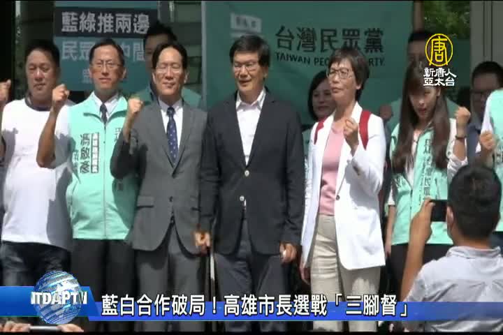 【新唐人亞太台 2020 年 06 月 24 日訊】今日就是高雄市長補選參選登記截止日,藍綠白參選人都選在今天登記參選,國民黨徵召高雄市議員李眉蓁、民進黨徵召前行政院副院長陳其邁,民眾黨與國民黨合作破局,徵召親民黨籍高雄市議員吳益政,高雄市長補選,將形成「三腳督」的戰況。