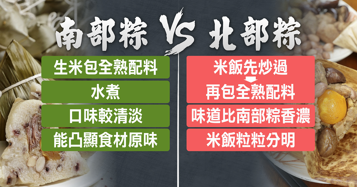 南部粽、北部粽各有擁護者,南部粽將生米包裹全熟配料,由於沒有油炒,只有水煮,口味較清淡,能凸顯食材原味。而北部粽的米飯會先炒過,再包配料,跟南部粽相比味道更香濃,米粒也較粒粒分明。粽子百百種,光是台灣南北就大異其趣,不過現在中共卻要訂定「粽子國際標準」,從形狀、口味到英文拼音都要管。