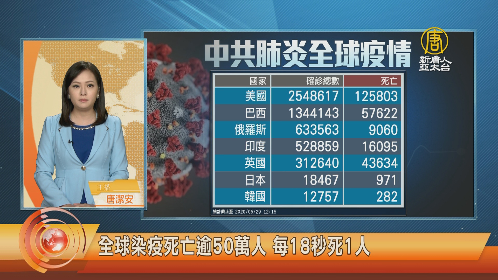 【新唐人亞太台 2020 年 06 月 29 日訊】再來關心中共肺炎動態,目前全球公開數據,累計確診超過1千11萬人,死亡50萬人,根據路透的資料平均值,每天有超過4千7百人死亡,也就是每18秒就有1人死亡。但中共、伊朗等國家,被認為嚴重低報數據。病例最多的國家依序是美國,有254萬7千例,已經連續3天新增4萬例確診。其次是巴西134萬4千例,第三是俄羅斯63萬3千例。
