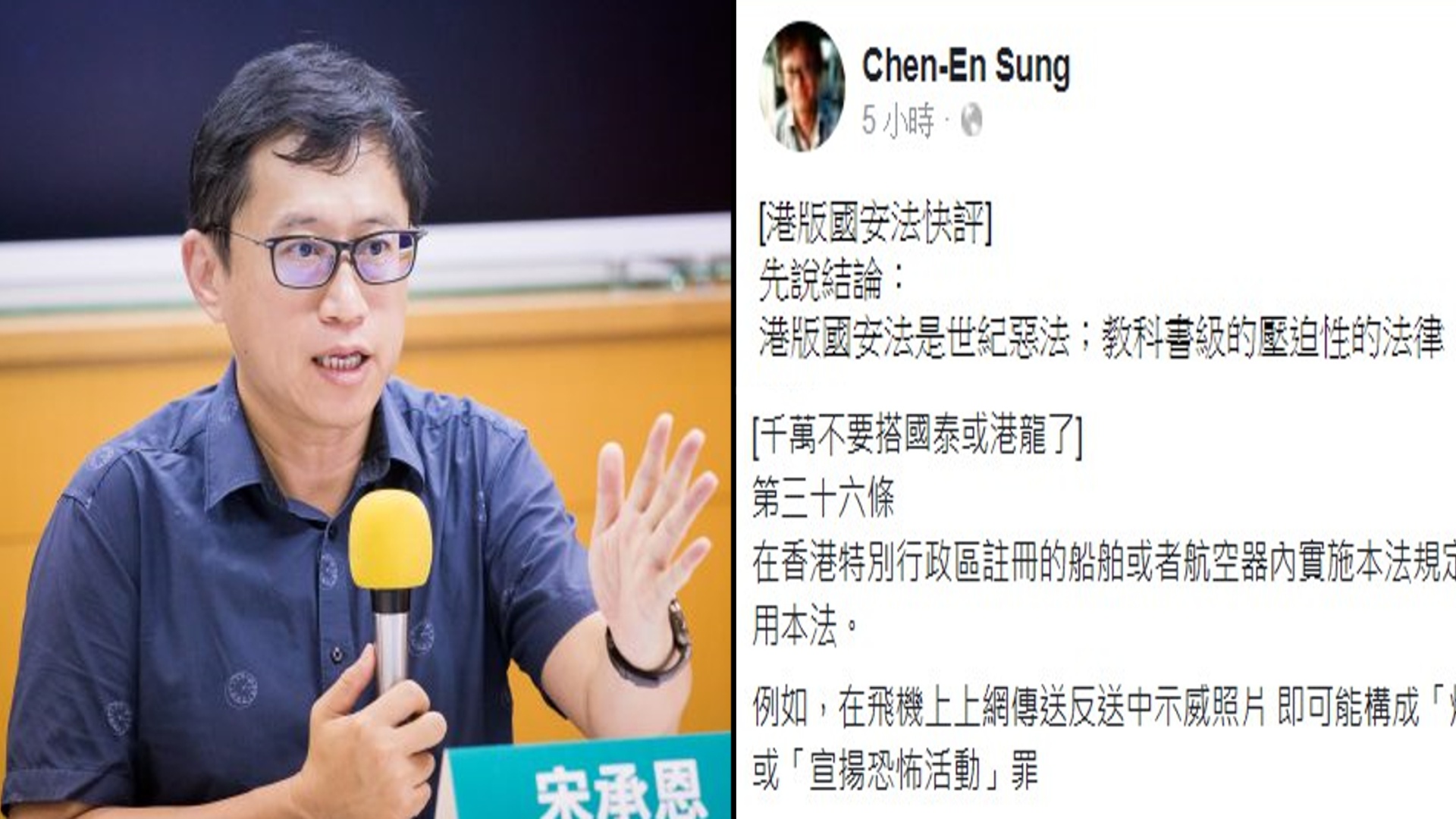 宋承恩還說,千萬不要搭國泰或港龍了,在飛機上上網傳送反送中示威照片,就可能構成「煽動分裂國家」。