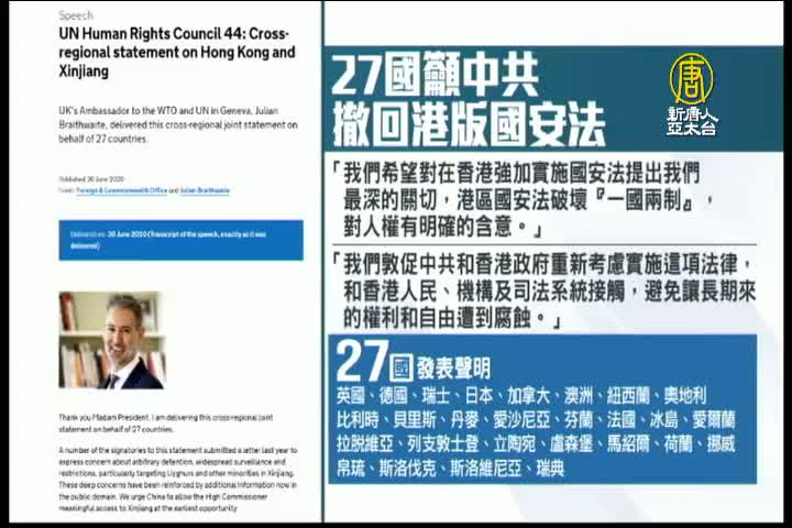 30號,27個國家在聯合國人權理事會發表聲明,敦促中共重新考慮在香港實施國安法。