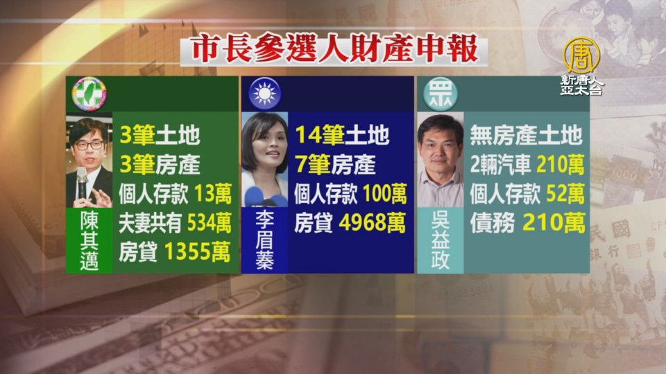 陳其邁名下土地跟房產各三筆,個人存款居然只有13萬,房貸高達1355萬。而對手李眉蓁則房產土地加起來超過20筆,但房貸也高達近5千萬。民眾黨推出的吳益政,旗下沒有房產土地,只有兩部車,還有210萬的負債,三位參選人怎麼管帳,也讓外界關注。