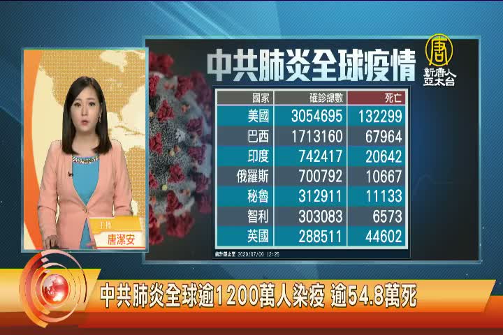 【新唐人亞太台 2020 年 07 月 09 日訊】午報頭條先來關心中共肺炎動態,目前全球公開數據,累計確診超過1200萬人,死亡54萬8千人,其中 中共、伊朗等國家,被認為嚴重低報數據。美國確診超過305萬4千人、死亡13萬2千多人。巴西確診超過 171萬3千人、死亡6萬7千多人。印度確診超過 74萬2千人、死亡 2萬多人。俄羅斯確診超過 70萬人、死亡1萬多人。