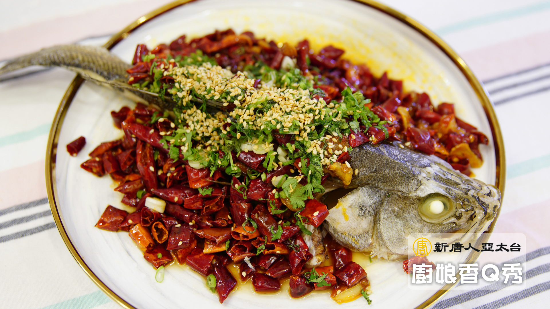 鱸魚1尾、去籽乾辣椒50g、豆瓣醬30g、蔥、香菜、芝麻適量、糖100g、花椒油/辣油1:1