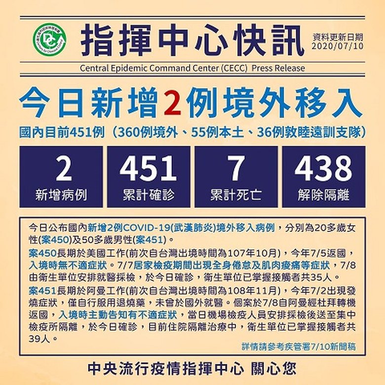 指揮中心表示,案451長期於阿曼工作(前次自台灣出境時間為108年11月),今年7月2日出現發燒症狀,僅自行服用退燒藥,未曾於國外就醫。個案於7月8日自阿曼經杜拜轉機返國,入境時主動告知有不適症狀,當日機場檢疫人員安排採檢後送至集中檢疫所隔離,於今日確診,目前住院隔離治療中。衛生單位已掌握接觸者共39人,其中22人為同班機前後兩排旅客,列為居家隔離對象;另17人為航空公司機組人員,皆非本國籍且未入境台灣,將透過國際衛生條例國家對口單位(IHR National Focal Point)通知相關單位。