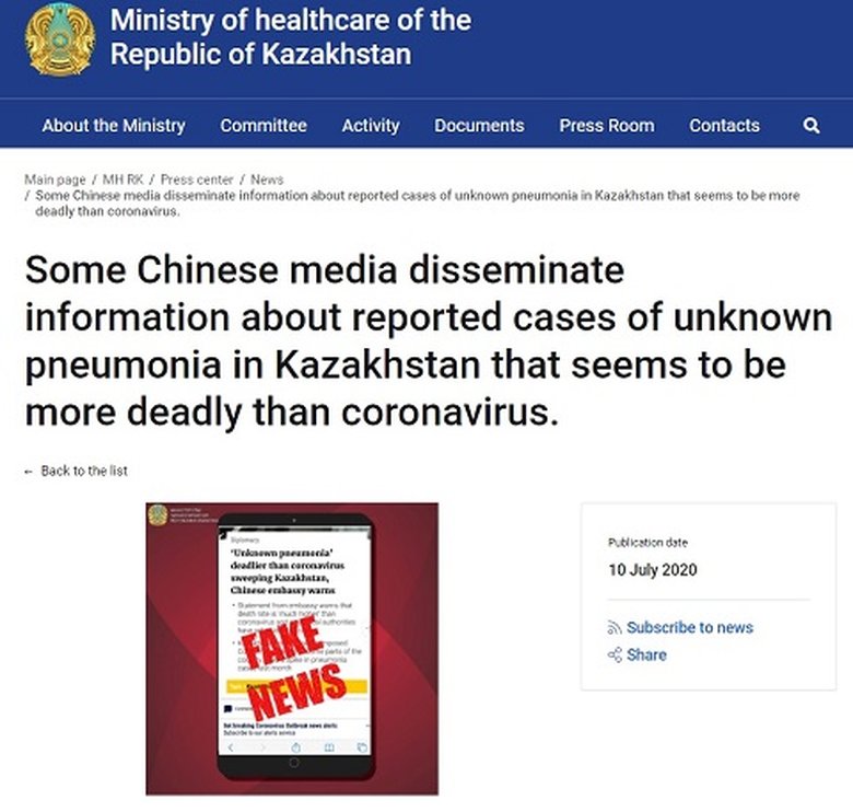 根據歐洲動態報導,哈薩克衛生部就部份中國媒體報導哈國「不明肺炎」一事,發聲明回應。聲明有英文版,附圖是一個明顯是中國香港報章《南華早報》的相關報導,然後上面蓋了英文字「假新聞」(FAKE NEWS)。
