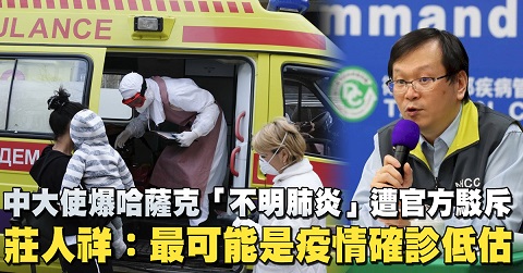 中國大陸駐哈薩克大使館9日公告,當地爆發不明肺炎,截至目前已有1772人死亡,致死率遠高於中共肺炎;不過遭到哈薩克衛生部否認,並指「不明肺炎」的相關報導是錯誤的。中央流行疫情指揮中心發言人莊人祥今(10)日表示,初步瞭解,哈薩克當地新冠疫情嚴重,所謂不明原因肺炎最有可能是中共肺炎低估情形。