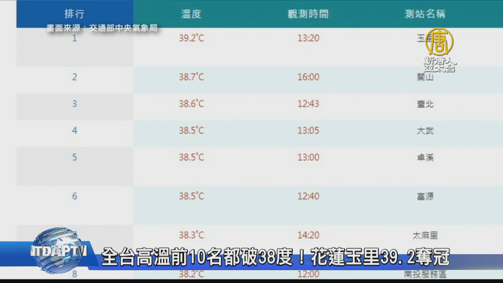 【新唐人亞太台 2020 年 07 月 10 日訊】歡迎回來,帶您關心,今天真的好熱,受太平洋高壓及西南風沉降影響,台灣今天出現極端高溫現象。氣象局針對18個縣市,發佈高溫警示,根據觀測資料顯示,今天高溫排行前10名,都超過攝氏38度。其中最高溫39.2度,出現在花蓮玉里,第二名是台東關山的 38.7度,第三名則是台北的 38.6度。氣象局提醒民眾,應減少非必要的戶外活動、注意防曬、以及多補充水份。