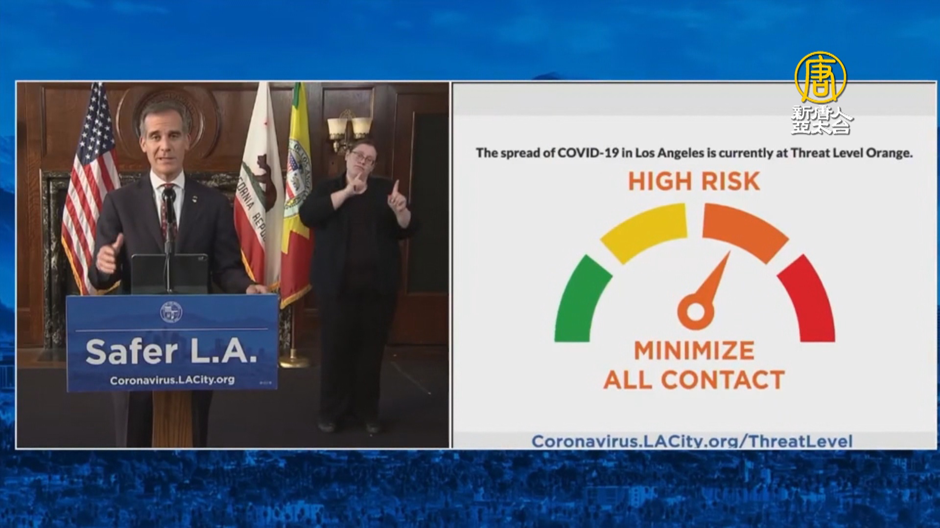 洛杉磯市市長 賈西迪:「如果繼續惡化,指針就會落到紅色區域,感染病毒的危險上升至最高,意味著我們可能重新封城。」