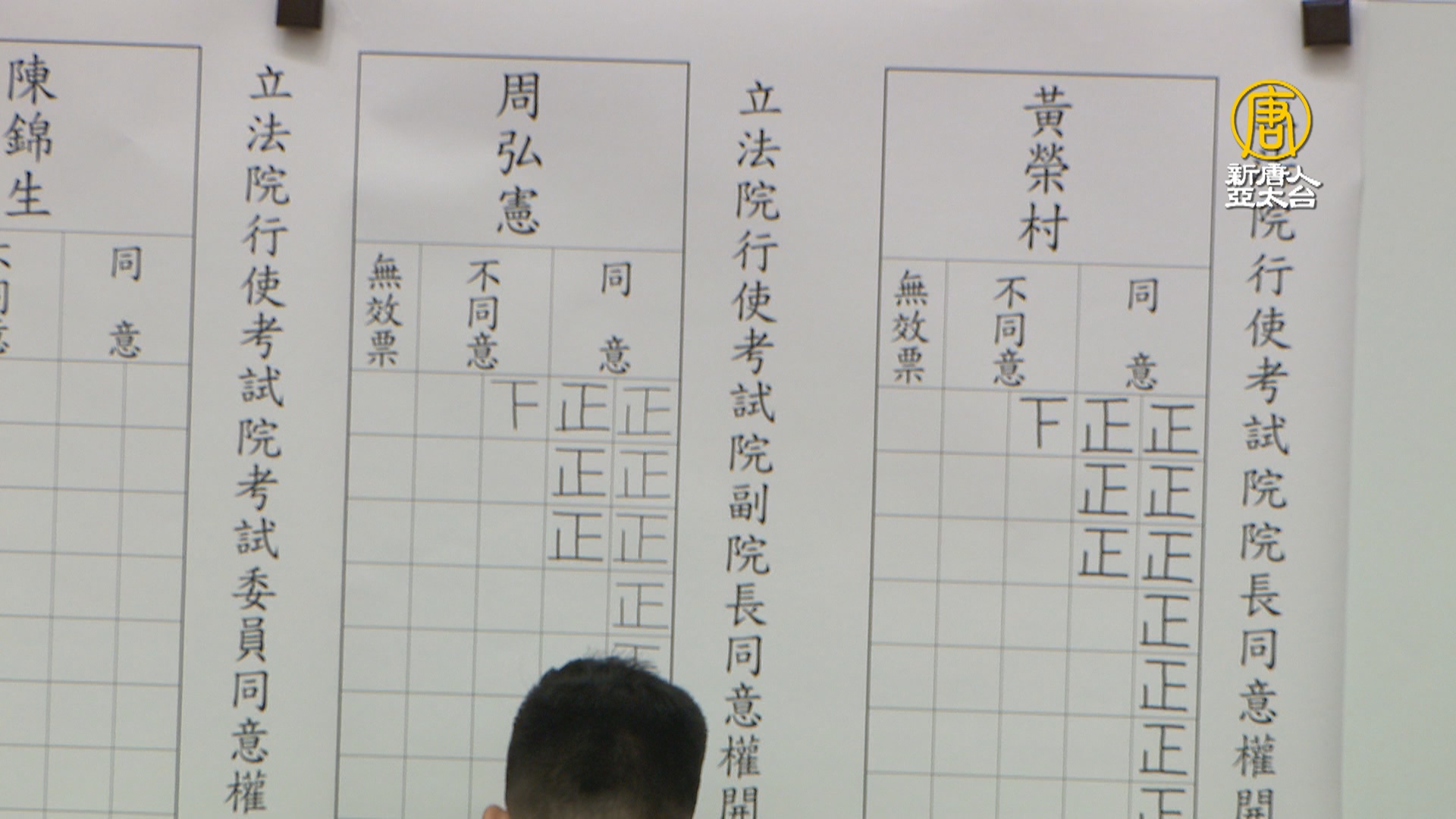 【新唐人亞太台 2020 年 07 月 10 日訊】立法院針對考試院人事,行使同意權,包括院長黃榮村、副院長周弘憲在內共11位被提名人,都順利過關,只有時代力量,因為日前發問卷被已讀不回,投下不同意票。而下午進行國家通訊傳播委員會(NCC)人事同意權案投票,NCC主委被提名人陳耀祥,經過出席立委過半數同意通過。