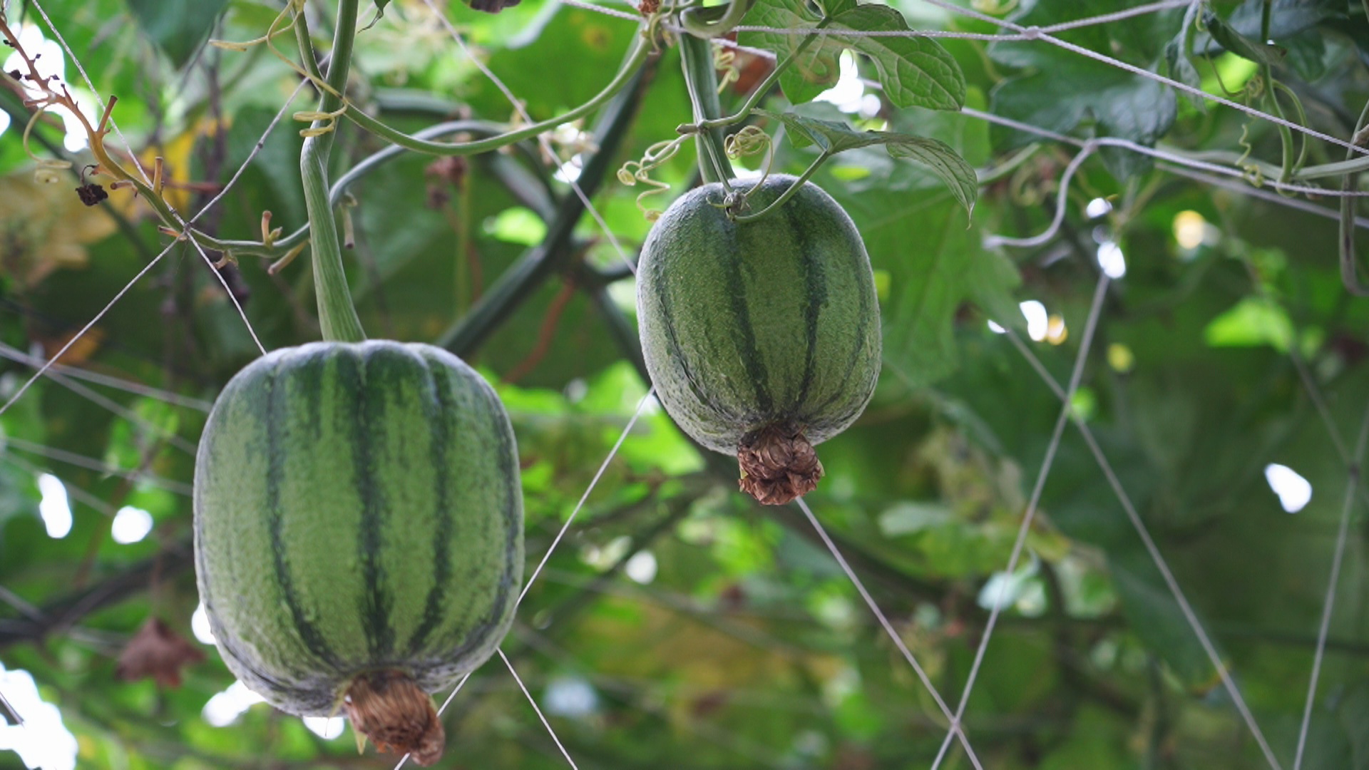 雖然是酷夏,但大伙站在絲瓜棚下覺得很清涼,抬頭看像不像迷你版的綠色熱氣球呢,造型小巧可愛,因為可以生食,所以取名「水果絲瓜」。