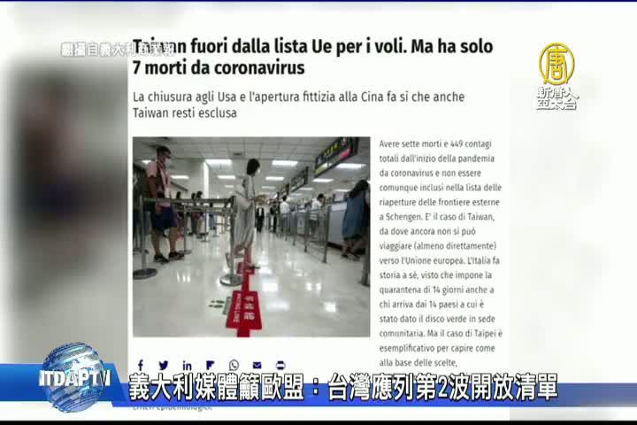 【新唐人亞太台 2020 年 07 月 11 日訊】多家義大利媒體報導,歐盟6月底首波開放邊境清單未列台灣。義大利商業報主編藍柏提8日撰文質疑,台灣只有7例死亡案例,卻不在歐盟首波開放邊境清單之列,不合常理。商業報說。義大利政府似乎不想刺激中共,因此將台灣排除在開放邊界名單之外,報導引述中華民國駐義代表李新穎的話,表示台灣嚴密監控疫情發展,與WHO、歐盟及義大利共享資訊,並向歐盟及義國捐贈口罩、呼吸機、防疫器材,盼義國政界、輿論界大力支持台灣列入下一波開放邊境名單。