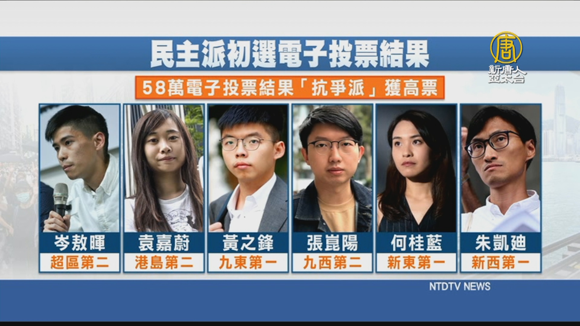 主辦單位公布其中 58 萬電子投票結果,以「抗爭派」自居的岑敖暉(超區第二)、袁嘉蔚(港島第二)、黃之鋒(九東第一)、張崑陽(九西第二)、何桂藍(新東第一)、朱凱?(新西第一),全部獲得高票,可望入圍。藉由初選選出候選人,香港民主派陣營期望,在9月的立法會選舉達到「35 」席次過半的目標,增加民主派在關鍵議程上的談判籌碼。