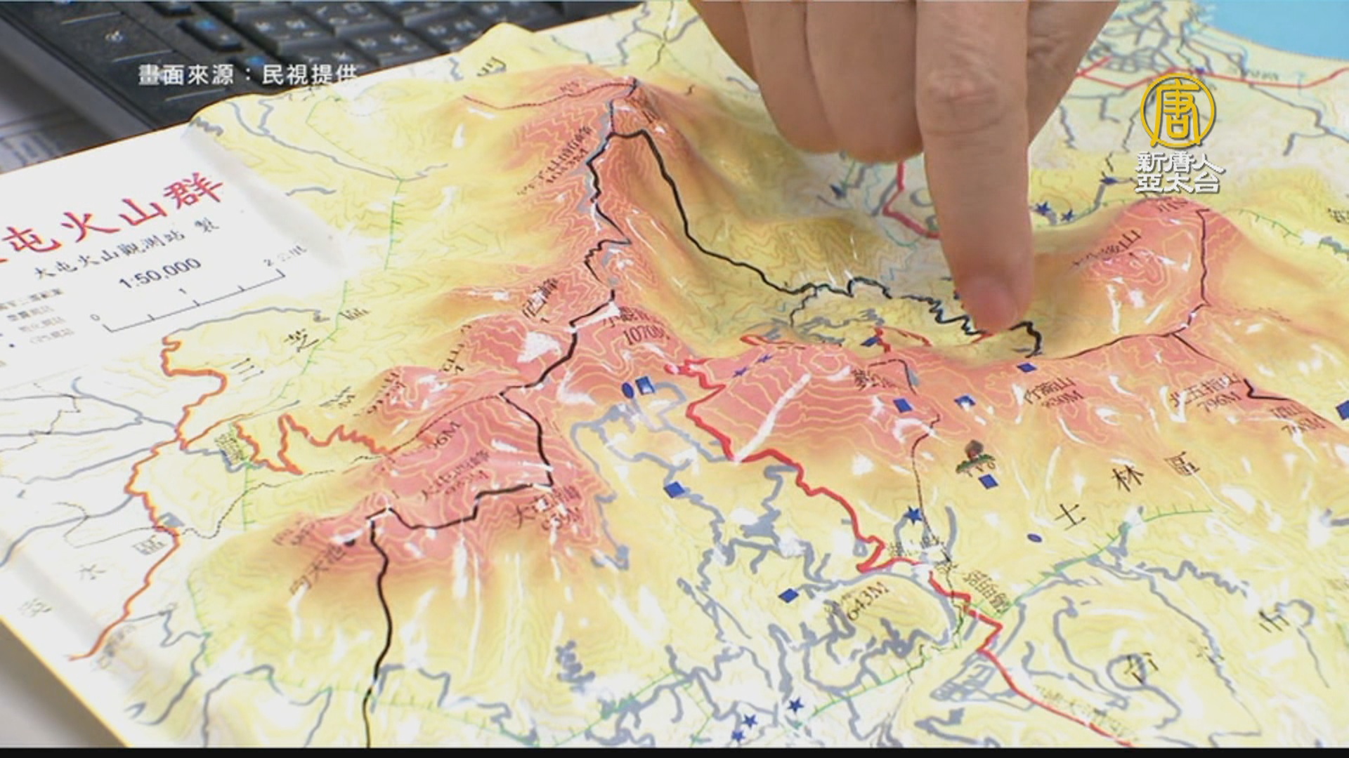手指的大屯山地形圖,他是中研院地科所副所長林正洪,他的研究團隊首次在大屯山發現火山通道。