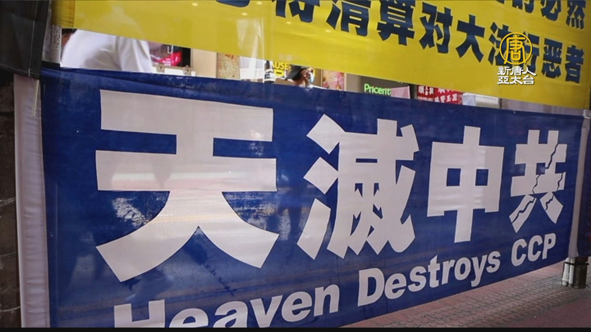 「天滅中共」、「停止迫害法輪功」、「法輪大法好」等橫幅,豎立在香港街頭。香港法輪功學員長年在景點、鬧市中心向民?講真相,派發介紹法輪功真相的單張,已經成為香港特殊一景。